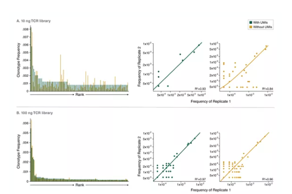 使用唯一分子標簽序列(UMI)實現(xiàn)克隆型的精準檢測。比較克隆型頻率:使用 10 ng 和 100 ng T 細胞總 RNA 制備人類 TCR 文庫,在有或沒有 UMI 情況下分別建庫。根據(jù)有 UMI 的測序結果,對前 100 個高表達克隆型進行排序。重復建庫,克隆型頻率重疊繪制于圖中。每個條形或圓點代表一個克隆,該克隆經(jīng)過總讀長分析或使用 UMI 過濾。使用 UMI 可對原始樣本中的起始 RNA 分子進行絕對定量。當將克隆按照富集度從高到底進行排序,沒有 UMI 的數(shù)據(jù)會導致 PCR 或測序擴增的偏差,從而誤導樣本中克隆型頻率的分析。UMI 的使用通過對起始樣本中 RNA 的絕對定量來校正偏差。使用 UMI 也可以在重復本之間實現(xiàn)更好的相關性,尤其是起始量較低時。各個文庫向下抽樣 500,000 reads。