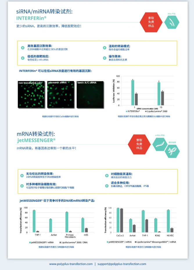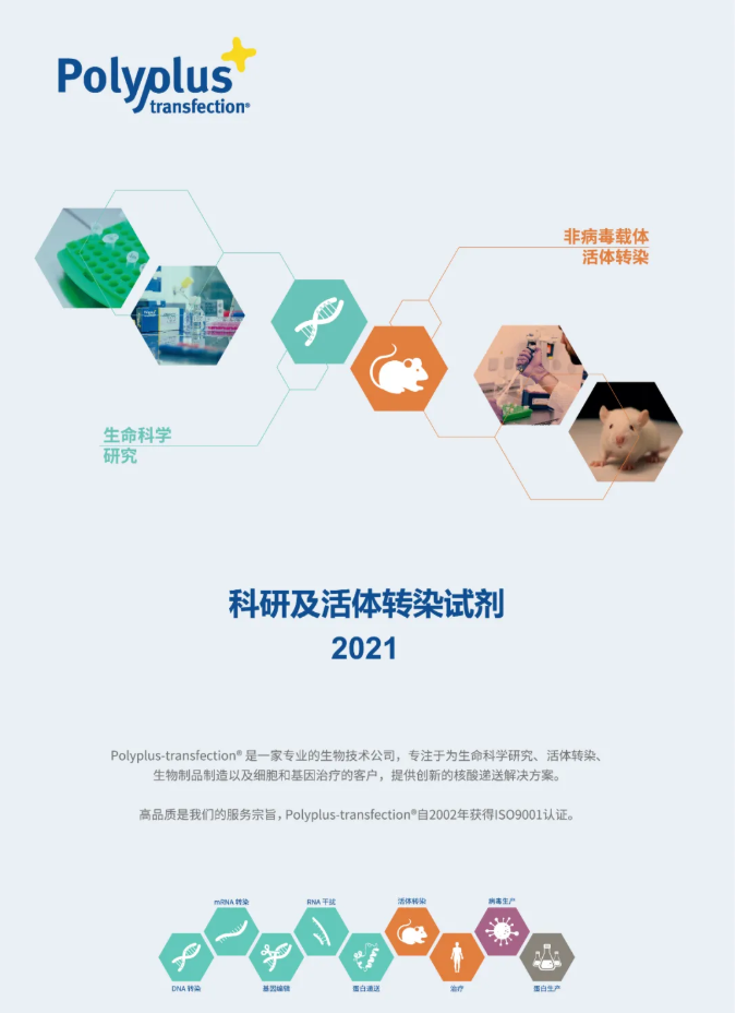 PolyPlus-transfection是一家位于法國的生物技術公司,目前已經(jīng)通過了ISO9001:2000質(zhì)量體系認證。該公司擁有20年的的轉(zhuǎn)染試劑研發(fā)經(jīng)驗,已經(jīng)開發(fā)了一系列的轉(zhuǎn)染試劑,如:基因的體內(nèi)和體外轉(zhuǎn)染試劑、寡核苷酸轉(zhuǎn)染試劑和siRNA轉(zhuǎn)染試劑等,可以根據(jù)不同的需要獲得穩(wěn)定或瞬時的轉(zhuǎn)染效果。并且提供基因和細胞治療解決方案中關鍵步驟GMP級別高質(zhì)量的轉(zhuǎn)染試劑。