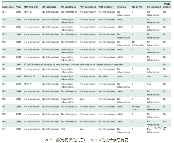 結(jié)果再現(xiàn)性問題2013年,《自然》(Nature)雜志發(fā)表的一篇論文綜述得出結(jié)論,自MIQE指南發(fā)布以來,有關(guān)RT-qPCR方案的必要信息的報告實際上有所惡化。雖然指南強烈建議納入必要的技術(shù)信息,但分析的10篇論文中沒有一篇報道了這一信息。這意味著沒有向讀者提供任何有關(guān)RNA完整性、RNA純度、RT條件或PCR效率的信息,而且所有的出版物都使用了一種不恰當?shù)臄?shù)據(jù)分析方法,這種方法在15年前已經(jīng)被質(zhì)疑。作者對《自然》雜志的20篇近期論文進行了重復分析,得出了基本相同的結(jié)論。更諷刺的是,報道透明度與期刊的影響因子呈負相關(guān)。