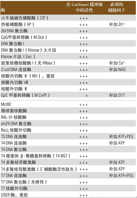 在常用的克隆酶中,選出了一系列 DNA 修飾酶,用 CutSmart 緩沖液代替隨酶提供的緩沖液,進(jìn)行酶活檢測。比較酶在 CutSmart 緩沖液(添加必須的輔助因子)和隨酶提供的緩沖液中的活性。反應(yīng)體系是根據(jù)修飾酶的推薦反應(yīng)體系建立的,用 CutSmart 反應(yīng)緩沖液替代隨酶提供的反應(yīng)緩沖液。結(jié)果比較如下表中所示。