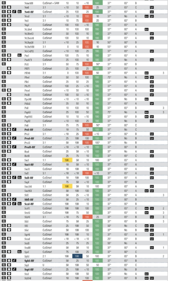 該表總結(jié)了 NEB 所有限制性內(nèi)切酶的活性信息。為了幫助您選擇雙酶切的最佳條件,該表列出了酶的最佳活性 NEBuffer(隨酶提供)和每種內(nèi)切酶在四個標(biāo)準(zhǔn)緩沖液中的活性。需要注意的是 BSA 現(xiàn)在已經(jīng)添加到緩沖液中,不再單獨提供。雙酶切反應(yīng)體系請參考 2013﹒2014 商品目錄第 276 頁。此外,活性表中列出了反應(yīng)溫度、熱失活溫度、推薦稀釋液、甲基化敏感性和該酶是否有省時酶特性(即在建議的反應(yīng)條件下,5-15 分鐘可完全切割底物,過夜酶切也不會降解 DNA)。
