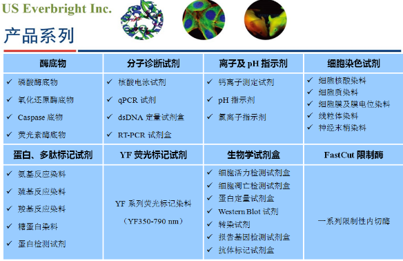 UE公司簡介:US Everbright? Inc.是一家由原Life technology Inc. 和Biotium Inc.兩家國際知名生物試劑公司的研發(fā)人員在美國創(chuàng)立的技術開發(fā)導向型企業(yè)。US Everbright? Inc.秉持“一流世界產(chǎn)品,一流專業(yè)服務”的宗旨,致力于為生命科學領域科研工作者提供最卓越的產(chǎn)品和最貼心的服務。